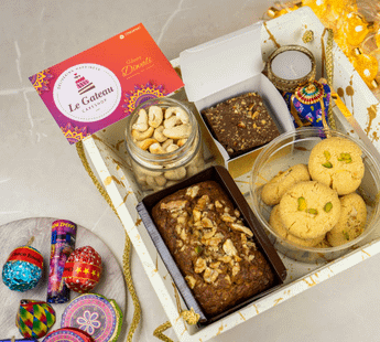 Banana walnut cake (200g), Box of nankhatai cookies(5pcs), Chocolate almond brownie(1pc), Jar of salted cashews(200ml), Cracker chocolates(5pcs) & Festive diya packed in a premium gift basket.
